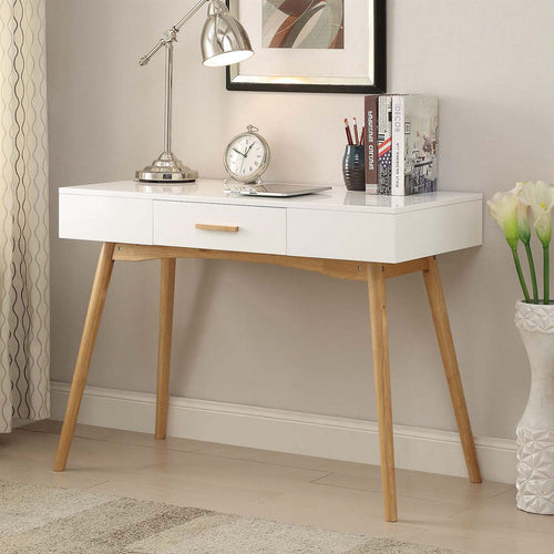 Modern Laptop Writing Desk in White with Natural Mid-Century Style Legs